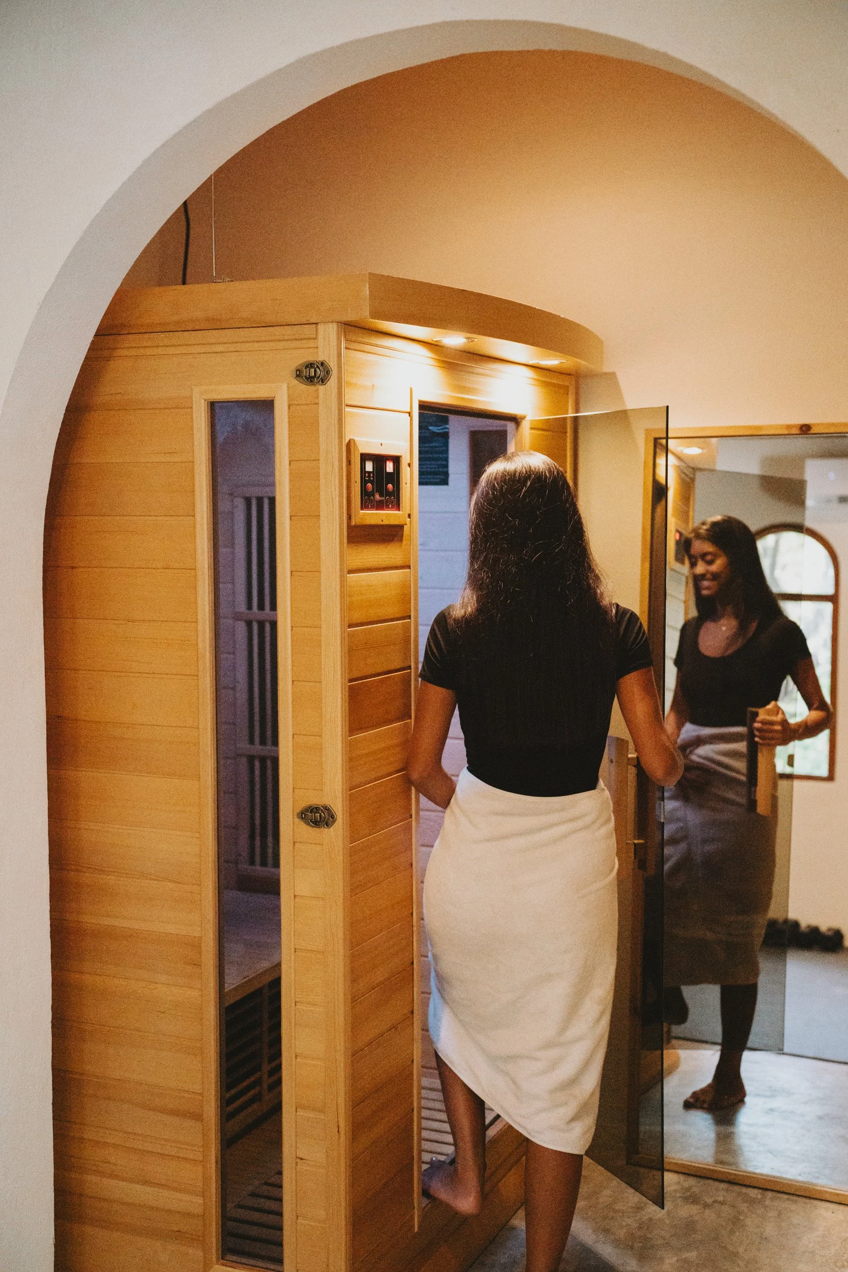 Uses infrared heaters to emit infrared light, which is absorbed by the body to produce heat. Infrared heat can penetrate deeper into the body compared to traditional saunas. This deep tissue penetration allows for increased sweating and detoxification at a cellular level. It can help release toxins, heavy metals, and other impurities from the body.